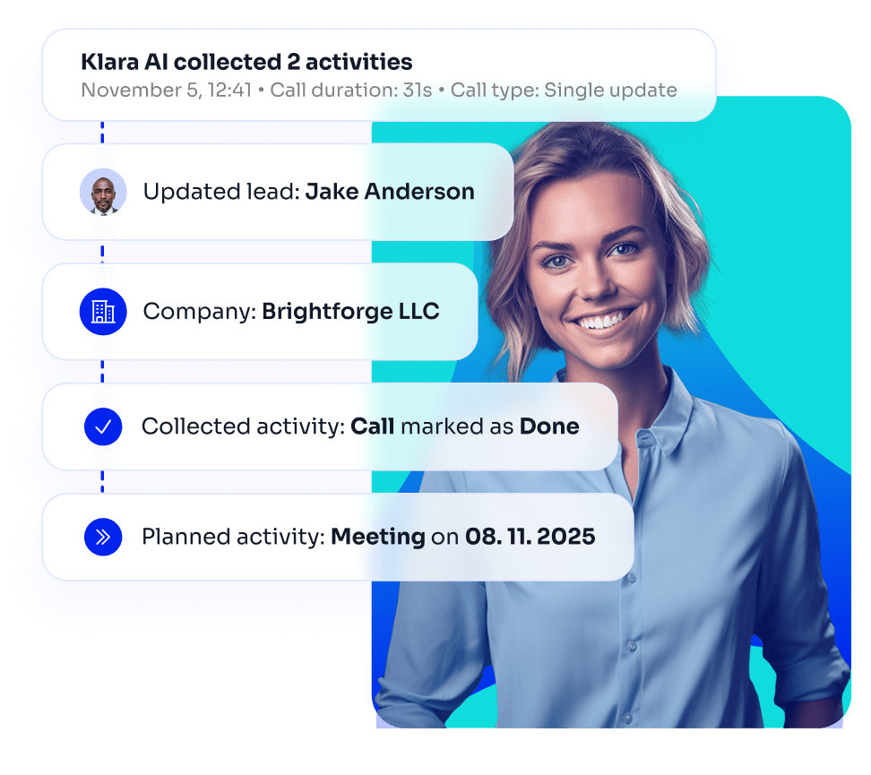 Klara AI makes sure no sales activity goes unrecorded. She daily gathers calls, meetings, and emails from your sales reps, fills the gaps in your CRM, and gives you a complete view of performance. Your team spends more time selling while you finally get the accurate data you need to drive growth.